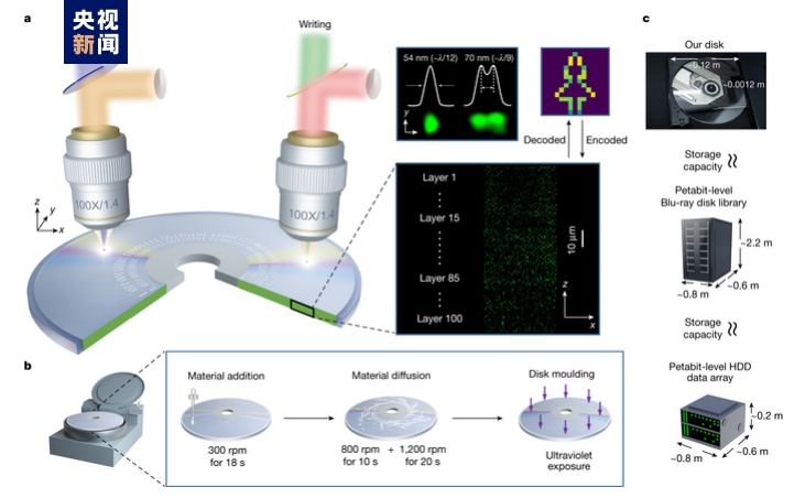 近日,中國科學院上海光學精密機械研究所(以下簡稱上海光機所)與上海理工大學等科研單位合作,在超大容量三維超分辨光存儲研究中取得突破性進展。研究團隊利用國際首創的雙光束調控聚集誘導發光超分辨光存儲技術,實驗上首次在信息寫入和讀出均突破了衍射極限的限制,實現了點尺寸為54nm、道間距為70nm的超分辨數據存儲,并完成了100層的多層記錄,單盤等效容量達Pb量級,對于我國在信息存儲領域突破“卡脖子”障礙、實現數字經濟的可持續發展具有重大意義。相關研究成果于2024年2月22日發表于《自然》(Nature)雜志。